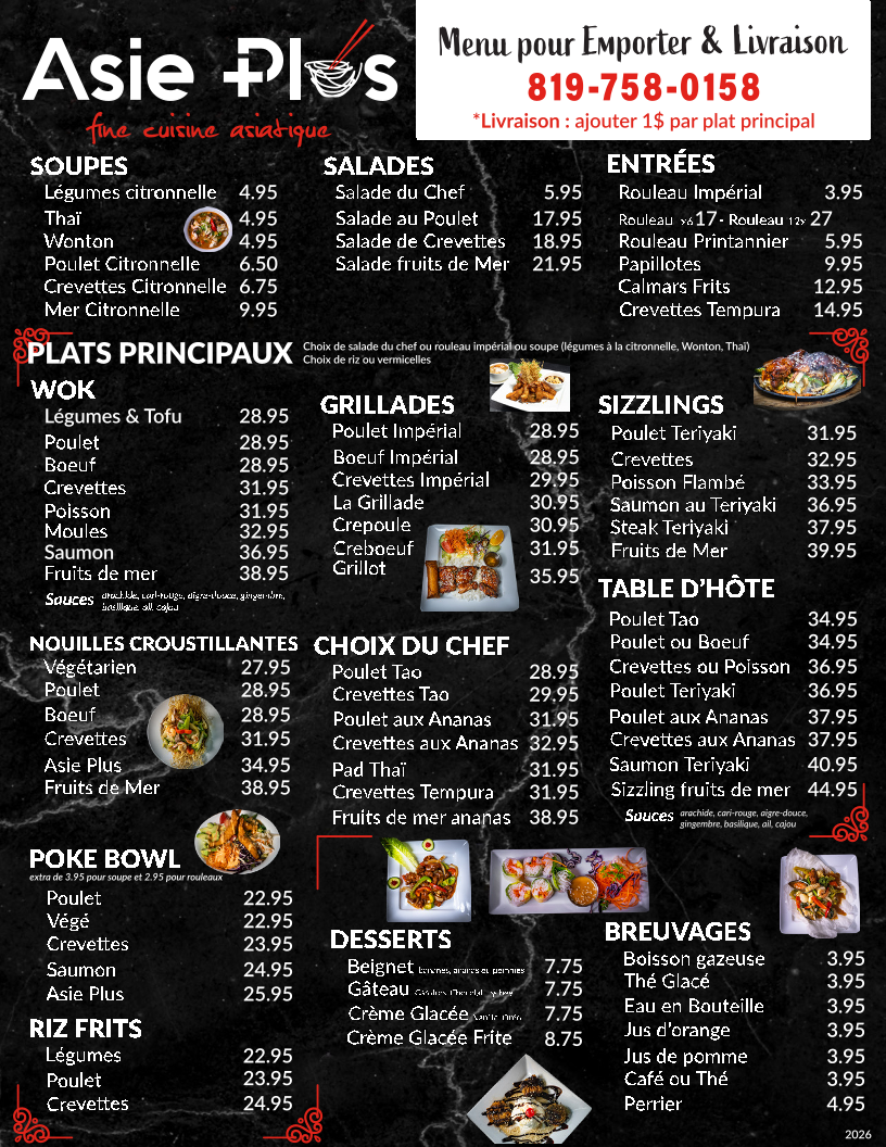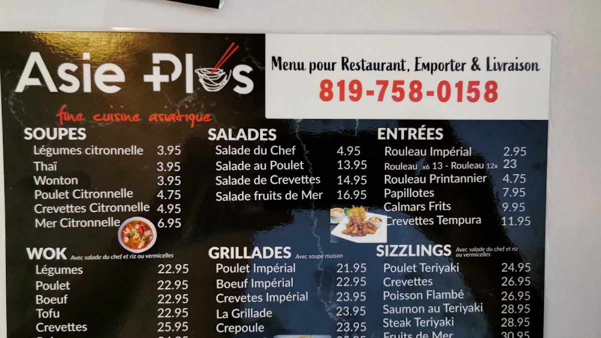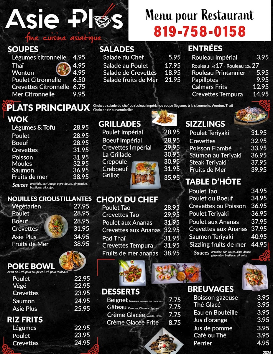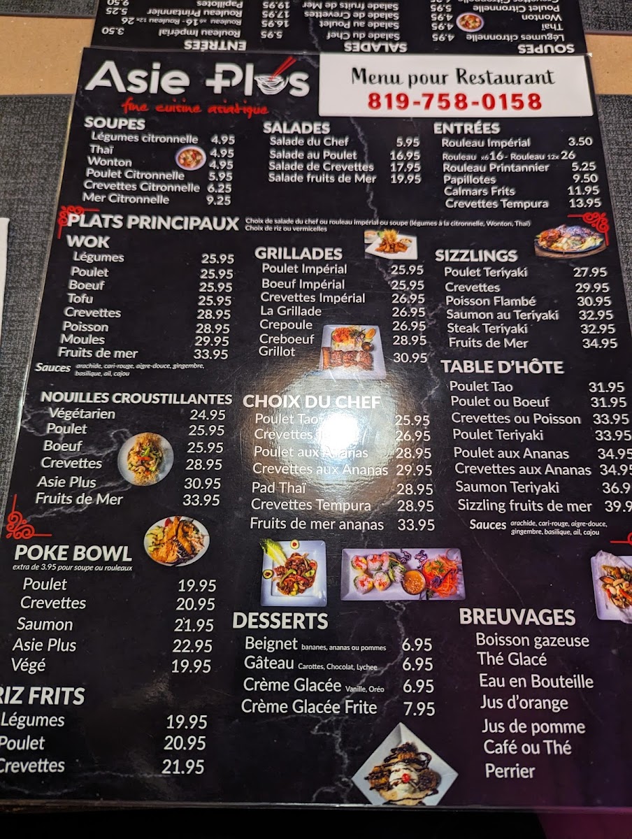 From a reviewer’s perspective, the menu at Restaurant Asie Plus offers a broad and satisfying exploration of Asian cuisine, with something for every craving. The variety stands out immediately, from comforting soups like Légumes citronnelle and Wonton to fresh options such as Salade du Chef and Salade de Crevettes. Appetizers like Rouleau Impérial and Crevettes Tempura set a strong tone, while mains span multiple styles, including wok dishes like Poulet, Boeuf, and Crevettes, as well as flavorful grill options such as Poulet Impérial and Boeuf Impérial. The sizzling selections-especially Poulet Teriyaki and Saumon au Teriyaki-add a dynamic touch. House specialties like Poulet Tao, Pad Thaï, and Crevettes aux Ananas highlight the kitchen’s versatility, while customizable choices in sections like SUR LE WOK and SPÉCIAL DU JOUR keep things interesting. The inclusion of POKE BOWL options such as Saumon and Poulet, along with comforting staples like Riz frits and crispy noodle dishes like Nouilles croustillantes Asie Plus, ensures a well-rounded menu. Ending with desserts like Crème Glacée Frite adds a fun finale. Overall, the menu feels extensive yet cohesive, offering both classic favorites and house specialties that make it appealing for both casual diners and those seeking variety.
