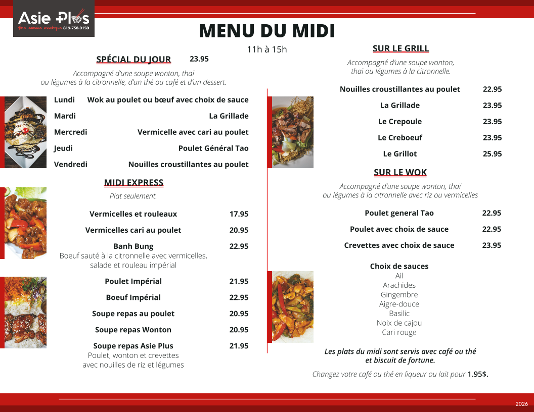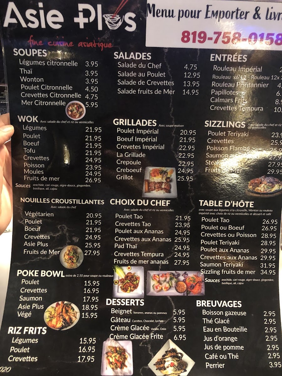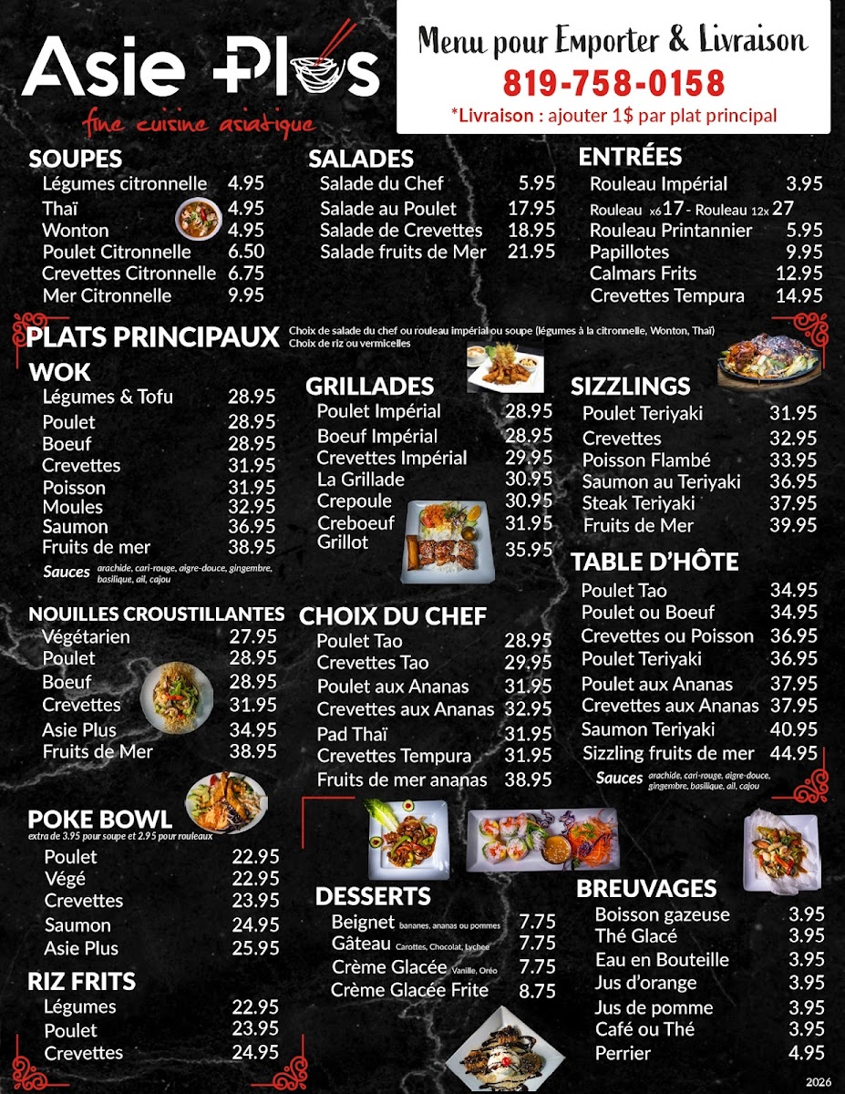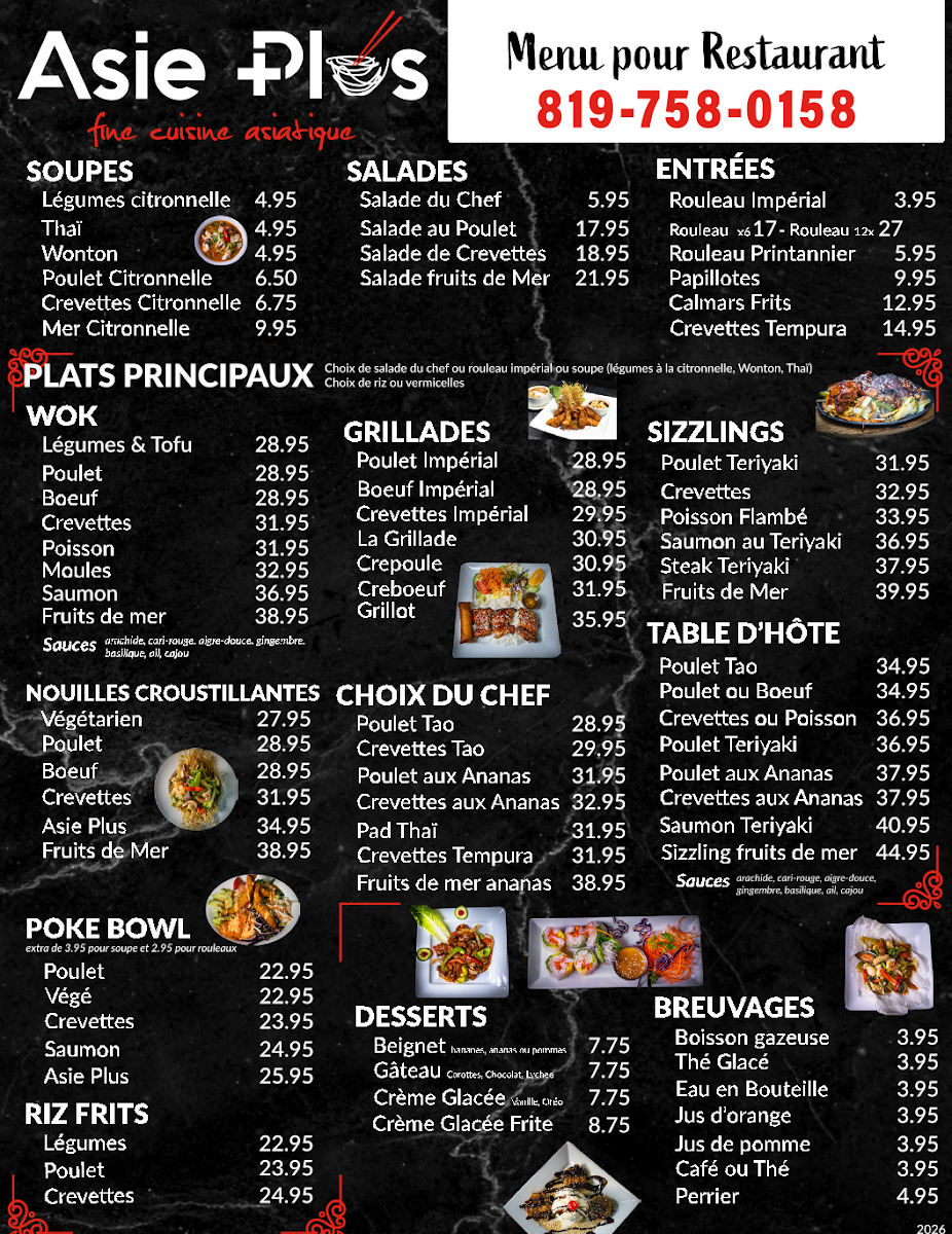 From a reviewer’s perspective, the menu at Restaurant Asie Plus offers a broad and satisfying exploration of Asian cuisine, with something for every craving. The variety stands out immediately, from comforting soups like Légumes citronnelle and Wonton to fresh options such as Salade du Chef and Salade de Crevettes. Appetizers like Rouleau Impérial and Crevettes Tempura set a strong tone, while mains span multiple styles, including wok dishes like Poulet, Boeuf, and Crevettes, as well as flavorful grill options such as Poulet Impérial and Boeuf Impérial. The sizzling selections-especially Poulet Teriyaki and Saumon au Teriyaki-add a dynamic touch. House specialties like Poulet Tao, Pad Thaï, and Crevettes aux Ananas highlight the kitchen’s versatility, while customizable choices in sections like SUR LE WOK and SPÉCIAL DU JOUR keep things interesting. The inclusion of POKE BOWL options such as Saumon and Poulet, along with comforting staples like Riz frits and crispy noodle dishes like Nouilles croustillantes Asie Plus, ensures a well-rounded menu. Ending with desserts like Crème Glacée Frite adds a fun finale. Overall, the menu feels extensive yet cohesive, offering both classic favorites and house specialties that make it appealing for both casual diners and those seeking variety.