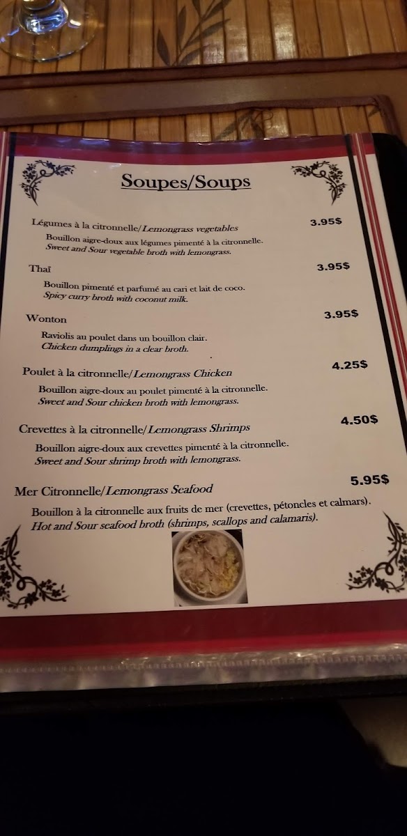 Accompagné d'une soupe wonton, thaï ou légumes à la citronnelle.